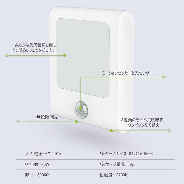 モーションセンサー:NLAAHCEの人感センサーライトはAUTOモード、OFFモードと3種類のモードがあります。“ON”モード-常時点灯(自動消灯できません)“OFF”モード -消灯 「AUTO」モード - 120°/3m以内の動きを感知すると自動的に点灯し、動きを感知しない状態が20秒前後続くと消灯する。※ご注意:明暗と人感センサーを同時に制御しので、十分な明るさがある場所では、動きを感知しても点灯しません。