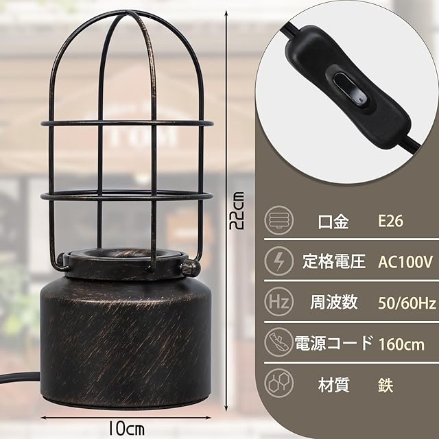 【商品仕様】商品サイズ:22*10.4*10.4cm、商品内径:9cm、重量: 約0.425kg(器具約0.37kg、電球約0.055kg)、電源コード長さ:145cm、材質:鉄、規格電圧:100V、口金:E26。電球仕様:LEDフィラメント電球、定格電圧:AC100V、口金:E26、消費電力:4W(40W形相当) 、全光束:450lm、色温度:電球色 2700k、 発光角度:360°、調光器非対応