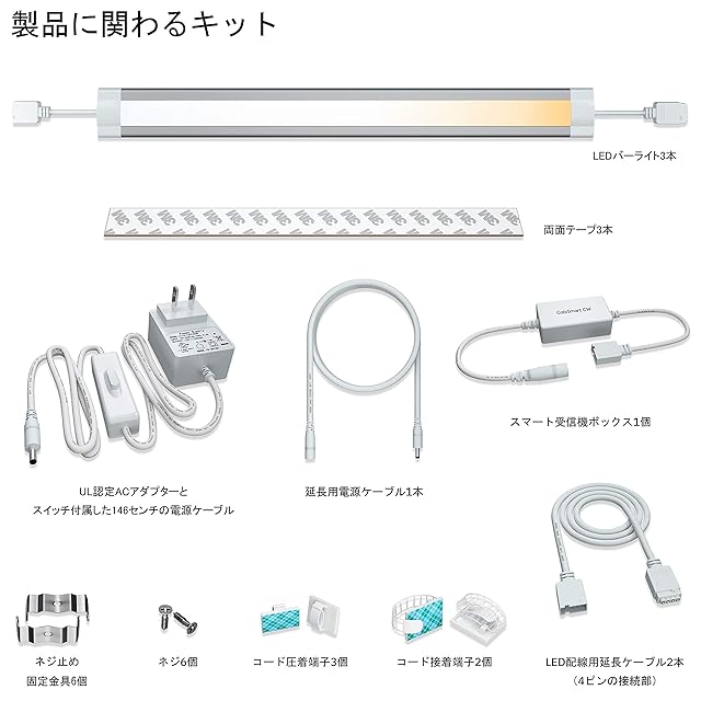商品名:LED スマート キャビネットライト バーライト スマート キッチンライト アプリ連携 Alexa Google Home 対応 遠隔操作 WIFI受信ユニット WIFIリモコン 無段階 調光調色 電球色~昼白色 音声コントロール 取り付け簡単 間接照明 節電 コンパクト オシャレ ベッドルーム 寝室 クロゼット 読書 インテリジェント照明(3個セット)