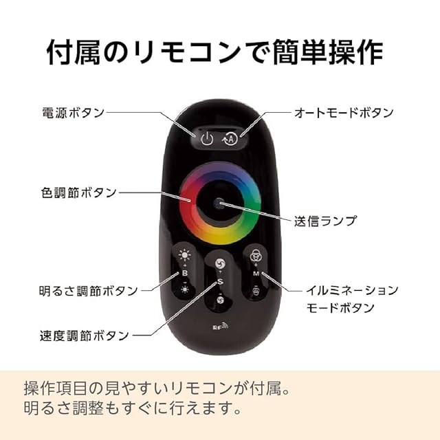 ■無段階カラー調節 単色ライトカラーは無段階で調節できます。 単色モード時の明るさは10段階で調節できます。 ■イルミネーションモード172種 イルミネーションモードの光り方は全172種。 イルミネーションモード時の光の動きの速さは10段階で調節できます。 ■リモコンで簡単遠隔操作 ■ライトの高さ 約155cm 本体カラーはブラックです。