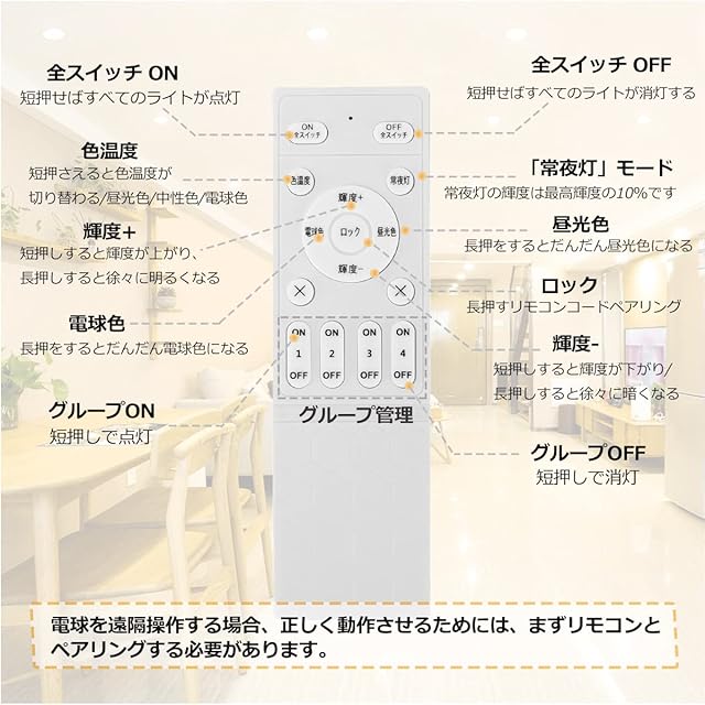 グループ管理&便利なリモコン操作 -- 2.4GHz無線式リモコンで家中の複数のLED電球をグループ分けし、グループ内に登録した電球の明るさ・色を調節できます。また、取扱説明書に従って、好みやニーズに合わせてグループ分けをリセットすることもできます。10M以内の360°ランプペアリング、調光、カラーコントロール、オン/オフ操作。