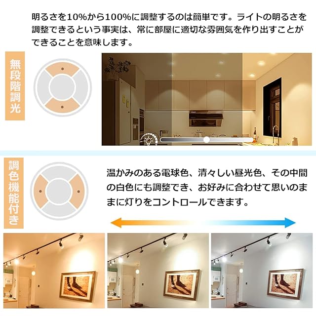 無段階調光調色機能&常夜灯機能 -- リモコン使用時無段階調光、明るさは10%~100 %の間で調節可能です場合によって明るさを自在に調節でき、温かみのある電球色とすがすがしい昼光色との間に転換できます。常夜灯モードにも対応可能、電気をつけて寝るのが好きなお年寄りやお子様にとって、とても便利なデザインです。