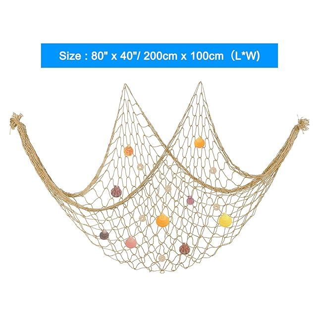 パッケージに含まれるもの:漁網装飾、約40"x80"(100cmx200cm)、装飾用貝殻、浮き輪、紐、フック5個。