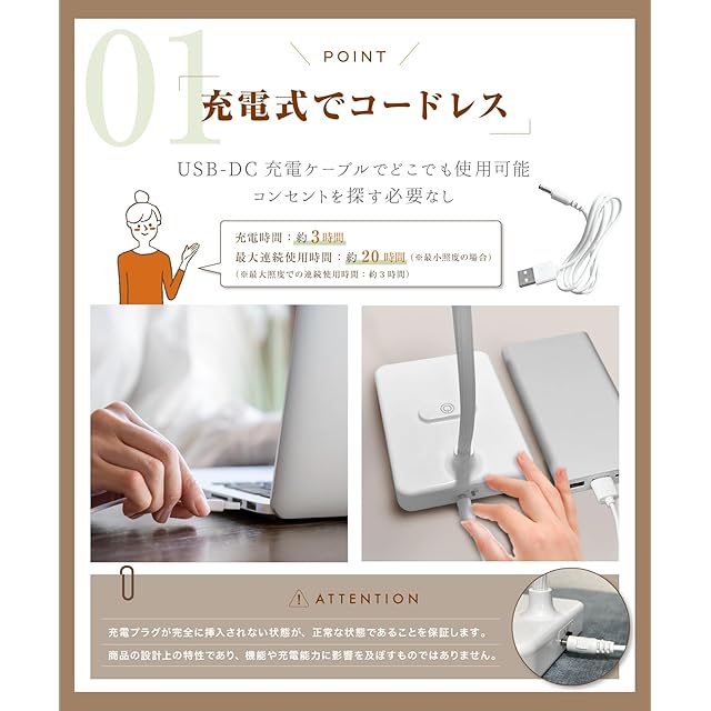 【コードレスな充電式デスクライト】:充電式設計で、コンパクトなサイズと軽量デザイン。煩わしいコードを気にせず、デスクや読書スペース、勉強机、リビングルームなど自由な場所で明るさを楽しんでください。 【フレキシブルなアーム】:アームの調節が自由自在で、光を正確に必要な場所に照射できます。 【シンプルな操作】:使いやすさを最優先に設計されたデスクライト。簡単な操作で、明るさを調整し、作業に集中できます。 【読書や勉強に最適】:デスクライトの明るさは、読書や勉強などの集中作業に最適に調整できます。目の負担を軽減し、長時間の作業も快適に行えます。 【スタイリッシュなデザイン】:シンプルなデザインが、どんなインテリアにも調和し、おしゃれな雰囲気を演出します。【ATTENTION】充電プラグが完全に挿入されない状態が正常な状態であることをします。商品の設計上の特性であり、機能や充電能力に影響を及ぼすものではありません。