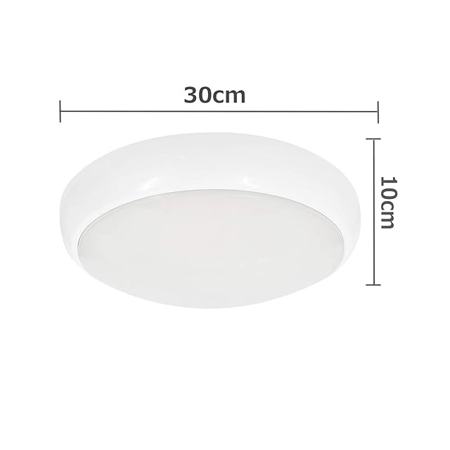商品サイズ(cm):直径約30cm×30高さ約10cm。重量:約550g材質:アクリル、AES。電源:AC100V(50/60Hz共用) 定格消費電力:15W 器具光束:約1500lm ●色温度:5000K●設計寿命:40000h