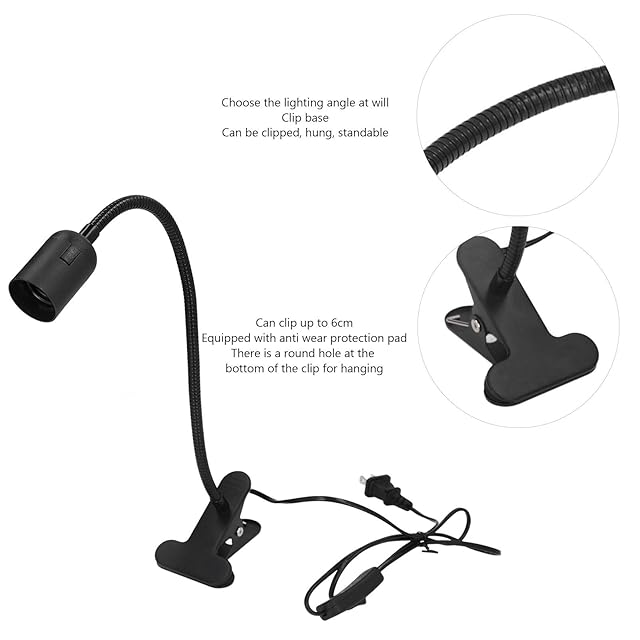 1. [クリップデザイン] 標準E27 / E26口径ランプホルダー、この仕様のサイズを満たす電球を置くことができ、ベースはクリップデザインで、デスクトップに簡単に固定できます。<br/>2. [360度調整可能] 360度調整可能な柔軟なグースネックを通じて位置を調整でき、夜の他の人の睡眠に影響を与えません。<br/>3. [取り付けが簡単] E26 / E27電球はどこにでも簡単に取り付けることができ、ソケットプラグを電源に挿入し、ケーブルのスイッチボタンを押すだけで電球を制御できます。<br/>4. 【耐久性のある素材】高品質のアルミニウム合金とABS素材で作られており、耐久性があり、安全で、耐摩耗性があり、長期間使用できます。<br/>5. [幅広い用途]テーブルランプ、植物成長ランプ、水族館ランプ、リビングルーム、子供部屋、寝室、オフィス、地下室、庭などで広く使用されています。<br/><br/>仕様:<br/>アイテムタイプ:テーブルランプホルダー<br/>材質:アルミニウム合金+ ABS<br/>最大伸縮長さ:約 50センチメートル/19.7インチ<br/>電圧:100-240V<br/>コントロール:キースイッチ<br/>該当する電球:E27 / E26)別売り)<br/>仕様:黒シングルヘッド<br/>寿命:5年<br/>重量: 約 300g / 10.6オンス<br/><br/>使用方法:<br/>電球を挿入し、スイッチをオンにすると光ります(電球は含まれません)<br/><br/>パッキングリ