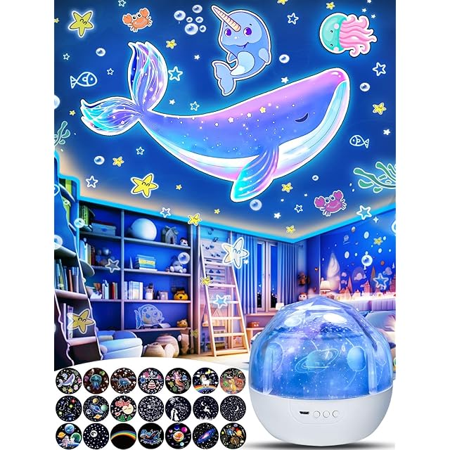 【多種点灯モード&360度回転】プロジェクターはホワイト、ブルー、イエローの3色ランプを搭載し、単色と混色総合6種類な点灯モード(白、青、黄、ドリームモード、ランニングライト、全灯モード)が作ってくれると、15種類映画フィルムを追加し、60種以上の投影視覚体験を豊かにすることができます。360度回転設計、より一層面白くなります。設定に応じて静止と回転できます。また、お好きな色に固定して点灯させ、素敵な夜を演出します。21種類の投影フィルムをお子さんの好みに設置し、星空を散歩したり、海洋生物たちを一緒に泳いだり、まるで夢の中にいるような幻想体験を親子一緒に楽しめます。
