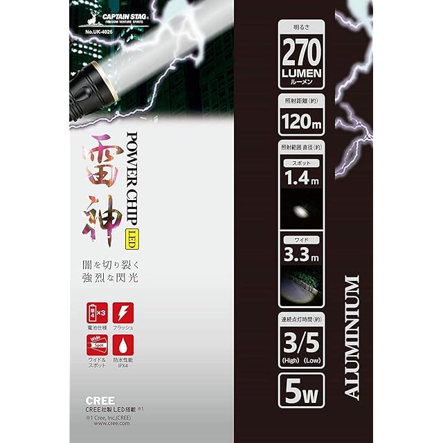 キャプテンスタッグ 雷神 アルミ パワー チップ型 LEDライト 5W-270 [ 明るさ270ルーメン / 連続点灯約3時間(High) / 連続点灯約5時間(Low) ]