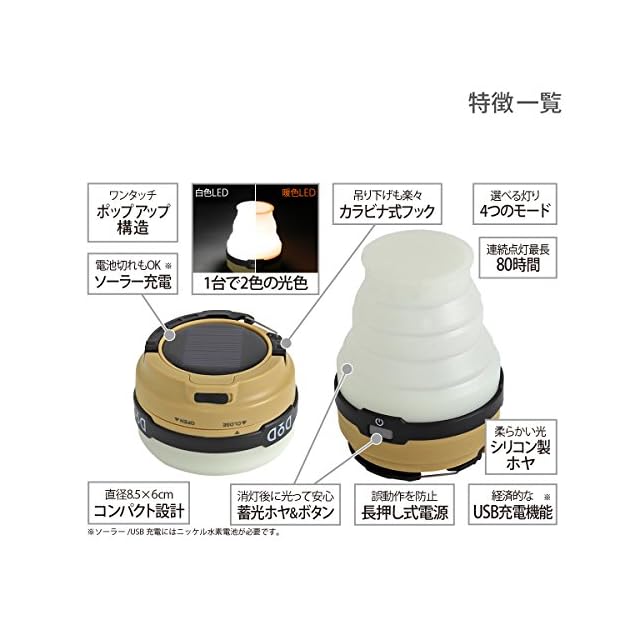 DOD(ディーオーディー) LED ソーラー ポップアップ ランタン USB充電(電池別売り) 連続点灯80時間 200ルーメン L1-427-TN タンカラー