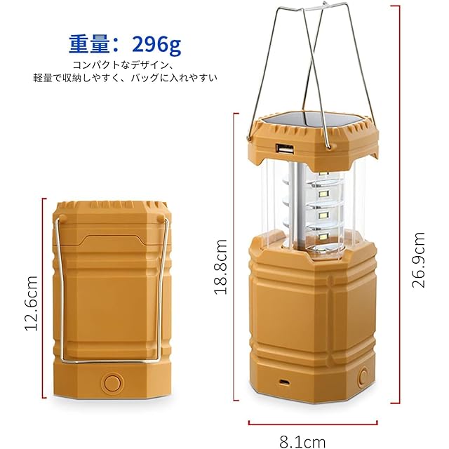 【IPX 4防水・折り畳み式・軽量コンパクト】この充電式ランタンは、IPX4の耐水性を備え、小雨や水滴がかかってもソーラーランタンには影響しません。防塵性・防水性に加え、高い耐久性を持ち、過酷な天候や複雑な環境にも耐えることができます。サイズは12.6×8.1×7.9cmで、重さは287gの軽量設計で、折りたたみ式のデザインがあり、ファミリーキャンプのように荷物が多くなりがちな場合にはぴったりです。コンパクトなため、置き場所を選びません。キャンプ、夜釣り、バーベキュー、山登り、停電、ハイキング、車中泊などの場面で、夜間照明として役立ちます。