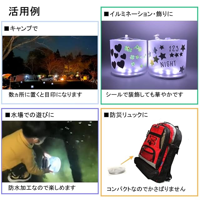 キャンプ、登山、夜釣りなどのアウトドア活動、家の周辺の明かり、クリスマスや誕生日などの賑わいのイルミネーションとして、また防災などの災害用への備えにも便利です。