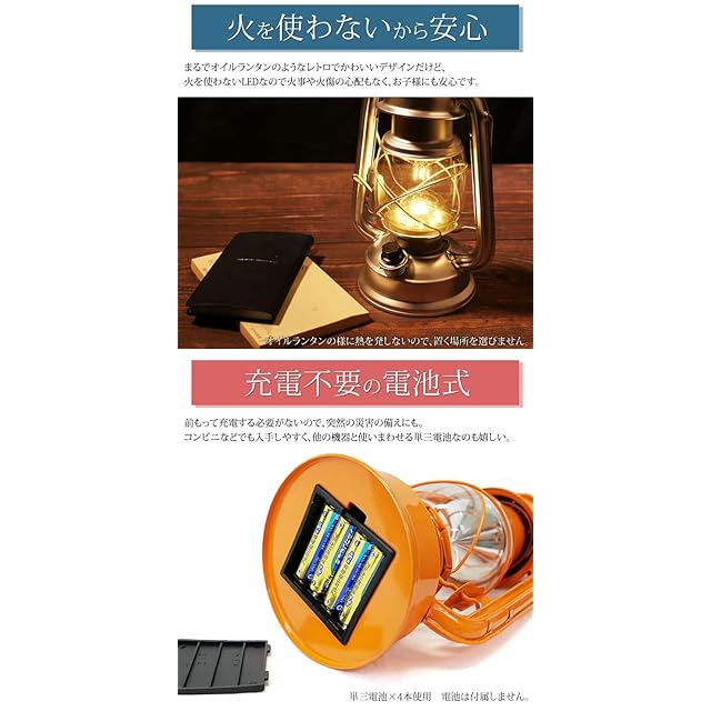 まるでオイルランタンのようなレトロでかわいいデザインだけど、 火を使わないLEDなので火事や火傷の心配もなく、お子様にも安心です。