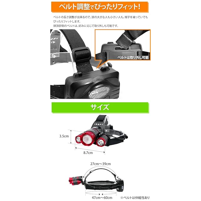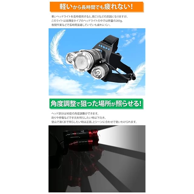 最大900ルーメンで明るい!:メインライトは500ルーメン、サブライトは200ルーメン×2灯。 3つすべて点灯すると驚異の明るさです。 街灯や月明かりの無い場所でも、昼間の様に明るく照らします。