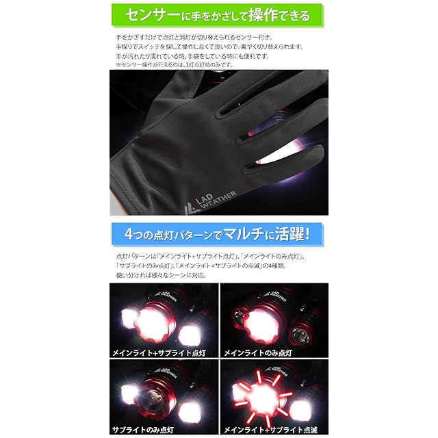 4つの点灯パターンでマルチに活躍!:点灯パターンは「メインライト+サブライト点灯」、「メインライトのみ点灯」、 「サブライトのみ点灯」、「メインライト+サブライトの点滅」の4種類。 使い分ければ様々なシーンに対応。