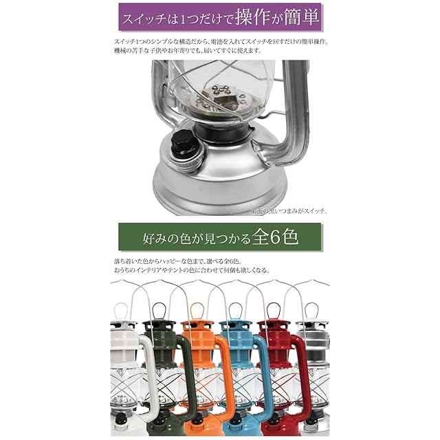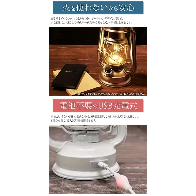 まるでオイルランタンのようなレトロでかわいいデザインだけど、 火を使わないLEDなので火事や火傷の心配もなく、お子様にも安心です。