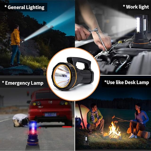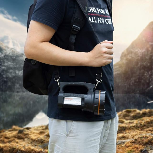 5.【マルチキャリングウェイ&防水耐水】ハンドヘルドやハンギング用のハンドル。 懐中電灯は肩紐でも動作し、底面には三脚や自転車ホルダーに懐中電灯を取り付けることができるネジ穴があります。 防水IPX4.船、ボート,海洋、釣り、狩猟、アウトドアキャンプ、自動車修理、作業灯,救助、停電、防災害のようないくつかの条件のための良い光