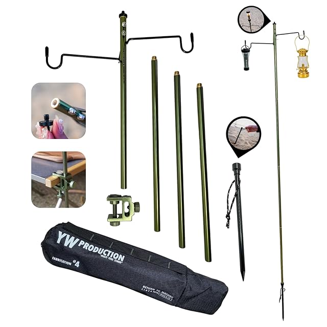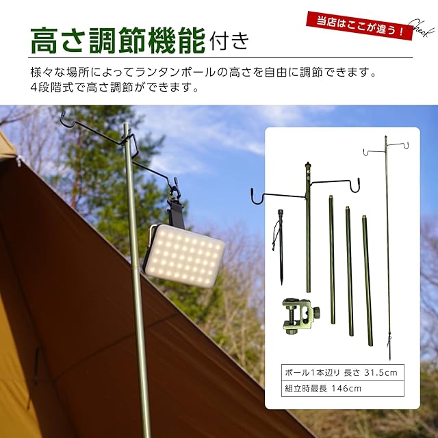 「頼れるアウトドアパートナー!軽量アルミ合金とステンレス製のランタンスタンド」高強度アルミ合金7075を使用したポールとステンレス製のランタンハンガーで、強度と耐久性に優れています。✅ペグはスチール製で、組み立て時には146cm、収納時にはコンパクトな40.5×8×5.5cmで、重量も軽量の550gです。最大耐重量は1kgで、テーブルの厚さが2.5cmまでの場所に取り付けることができます。✅ランタンハンガーのパーツにはステンレスを採用しています。錆にくく、強度があるため、野外での使用にも安心です。✅テーブルや地面の硬さによって耐荷重が異なりますが、1kgであれば、大抵のランタンに対応できます。