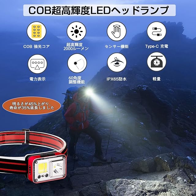 【ヘッドライト充電式・長時間点灯・高輝度LEDライト・防災停電対策】大容量リチウム電池が内蔵されているため、電池をご用意する必要がなく、充電するだけで長時間使用することが可能です。(Type-Cタイプ)また、LED+COBを採用しているため、高輝度で長寿命を保つことができます。そのため、地震や災害の際に非常に役にたち、夜の散歩やくらい場所での活動にも大活躍できます。
