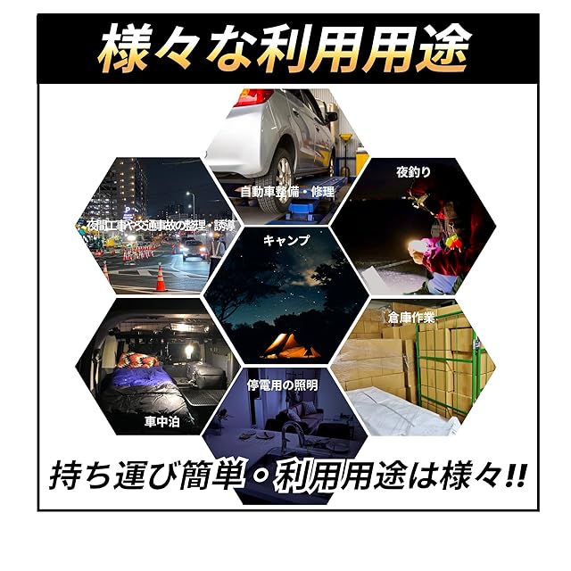 【商品説明】本ライトは、USBポート充電式ワークライトです。LEDライトの部分はアルミ製で優れた耐熱性と放熱性があります。180WのLEDライトですので、眩しいほど強い灯であると同時に、発光面のLEDは84個も設置されているので、広範囲に光を照らします。本LEDライトは日常業務だけでなく、暗い作業場での仕事、夜の屋外作業などにも適しています。さらに、災害時の停電など緊急時に使用できるだけでなく、USBポートでの充電が可能なので、外出時において、携帯電話などを充電することもできます。