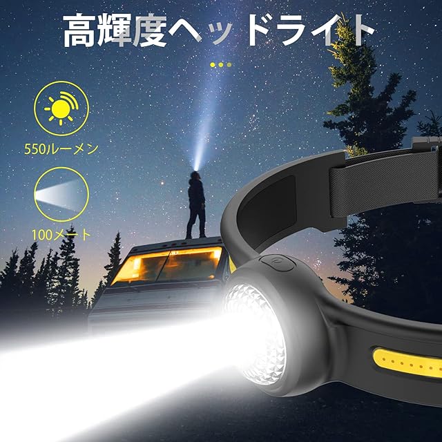 【高輝度270°広角度照明】本体は2種の高輝度光源があり、集光・散光は同時点灯可能で、最大照明角度は270°で、他社製品よりも照射角度がひろいです。明るさは550ルーメン、照射距離最大約100メートルを備えております。驚くべき超広角ヘッドライトは、夜間活動に新しい照明方法を提供します。登山、ランニング、釣り、自動車整備、洞窟探検、などでのアウトドア活動に大活躍します。