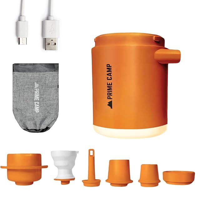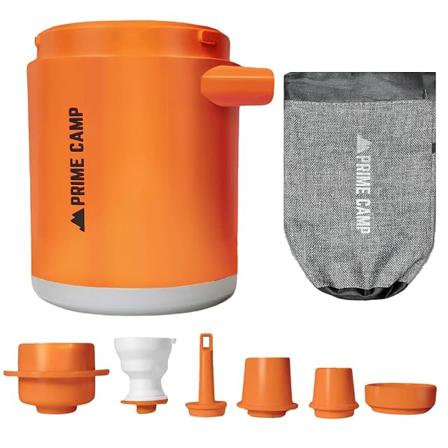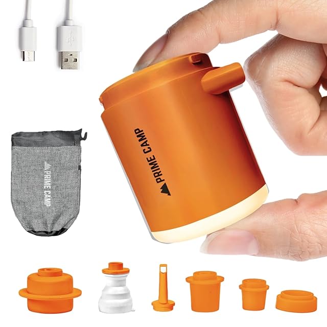 キャンプ エアーポンプ 電動 空気入れ 超軽量 強力170L/分 【6つのノズル&ライト付】 エアポンプ 1360mAh大容量バッテリー USB充電式 空気抜き インフレーターマット キャンプ 浮き輪 (オレンジ)