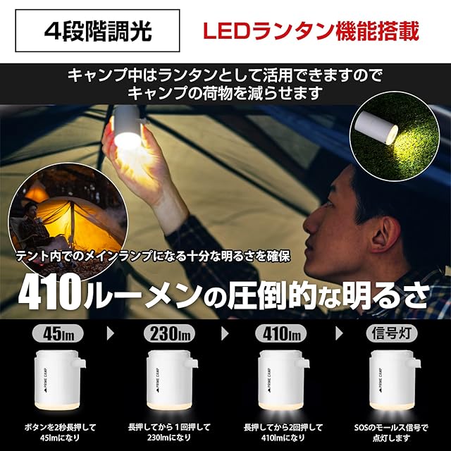 【4段階調整ライト機能付き】 4段階調整のライト機能つきなのでキャンプ中はランタンとしても活躍できます。最大明るさ410ルーメンなので、テント内のメインランプとしても活躍できます。ランタンをわざわざ持っていかなくていいのでキャンプの荷物も減らせて一石二鳥です。