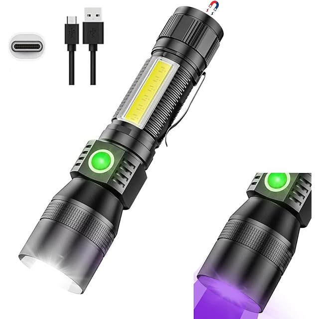 懐中電灯 LED 充電式 USB 強力 用 最強 ledライト COB作業灯 7モード 3 in 1 小型 マグネットテール ブラックライト IPX7防水 超高輝度 2600ルーメン 18650大容量バッテリーズーム式 ポケットクリップ 高輝度 軽量 ハンドライト led 明るい ライト 手持ちライト フラッシュライト 夜釣り用 キャンプ アウトドア 地震 停電 防災 対策 (1 pc)