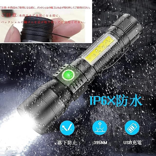 注意: まず尾の部分の蓋を取り出します。 お尻の周りに黒い輪ゴムがついています。これを取り出してから、蓋をしっかりねじってください。 輪ゴムを取り除かないと、懐中電灯が使えなくなるおそれがあります。【COB作業ライト+7モード点灯】懐中電灯側面に超大型ledビーズを装着して、COB白色光および赤色光機能をデザインしました。普通の懐中電灯よりも明るく、明るさは2600ルーメンに達し、2つのキーがそれぞれ懐中電灯の照明とCOB作業灯を制御します。操作が簡単になり、復雑なボタンを避けてボタンデザインを最適化した。