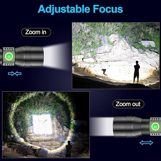 【USB出力、入力+知能電量表示+ズーム機能】電流が安定しており、使用安全性が高くなっています。 また、停電時にスマートフォンや小型機器に電力を供給するためのモバイル電源としても使用でき、非常に便利です。各ボタンには充電インジケーターライトが付いています。懐中電灯が充電中の場合、インジケーターライトは赤になります。 懐中電灯がフル充電後、インジケーターライトが緑色に変わります。 懐中電灯のヘッドは自由に伸縮でき、集光モードと遠距離照射モードの切り替えが可能で、遠隔集光モードは最大照射距離が2600m、180度広範囲照射モードは暗室全体を簡単に照射できる。