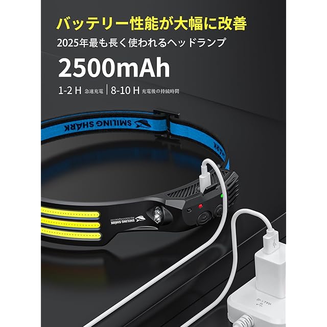 【超長時間連続使用】ヘッドランプは2500mAhのバッテリーで作動し、1回の充電で最大8時間の連続使用が可能。フル充電にかかる時間はわずか1~2時間です。(初回使用前に充電が必要)
