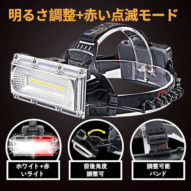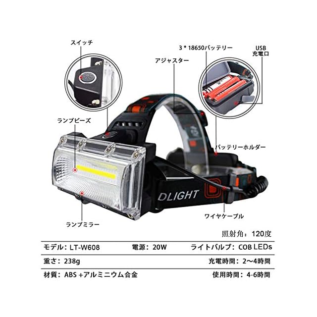 【120°広角と高輝度チップ搭載】:高品質のCOB集積led光源モジュールを使用し、高出力20WのLT-W608Nヘッドライトです。LEDライトとCOBライトの組み合わせで、高い貫通性があって、連続的均一な発光、最強1800ルーメン達し、明るさ抜群です。ユニークなワイドランプ設計、120度の広角で照らし、広範囲をキレイに照射することができます。暗闇の視界を保てることが最大の利点です。夜間釣り、徒歩、登山、キャンプ、日常使用など、さまざまな環境に適用して、安全ができます。