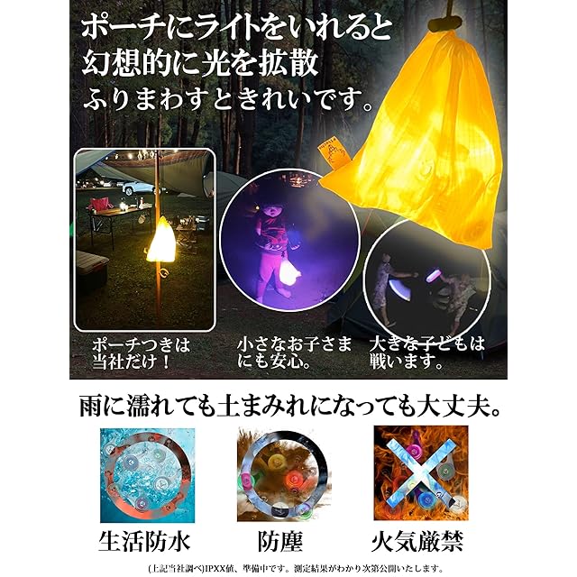 ✅ 【収納に便利なランタンポーチつき】はっ水加工で光を拡散する素材の布製ポーチつき。点灯したライトをいくつか入れるとやわらかい光を拡散してランタンのようにご使用いただけます。暗闇でぐるぐるしたり、お子さま用ランタンにしたり、と使い方いろいろ。(ふつうのランタン程は明るくないです。提灯レベルです。)