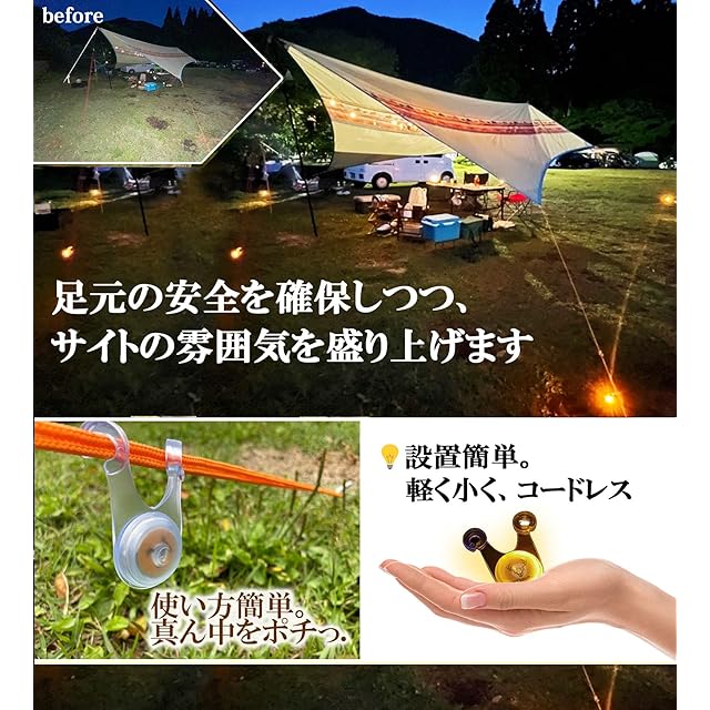 ✅ 【サイトをおしゃれに・ちょうど良い明るさ】いろいろな場所にひっかけて華やかさを演出できます。コードレスなので配置も簡単です。足元の安全を守りながらサイトの雰囲気を盛り上げます。ガイロープの根元に配置するとロープ位置がすぐにわかり、夜間の転倒防止に。(屋内で見ると結構な輝度に見えるのですが、実際に屋外で見ると程よい明るさに感じるかと思います。)【日常生活やフェスにも】ポーチつきなので持ち運びにも便利。フェスやライブ、夜の散歩などにも。ぴかぴか光るので子どもウケが抜群です。