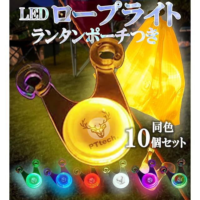 PTTech キャンプ ロープライト LED ガイロープライト 10個セット ランタンポーチつき 夜間の転倒防止に おしゃれサイトになるキャンプギア 防水 防災グッズ テント タープ アウトドア テントアクセサリー ロープ(張り綱) 200時間連続点灯 ペグライト