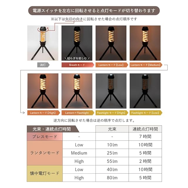 ✅【点灯順序】Breathモード⇒Lanternモード(Low⇒Medium⇒High)⇒Lanternモード(High)+Flashlightモード(High)⇒Flashlightモード(Low⇒High)【付属品】三脚・カラビナ・カラビナ用フック・USB充電コード(60cm)