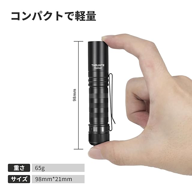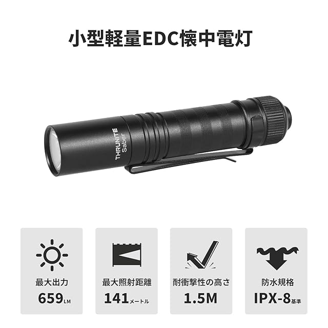 【パワフルの小型EDC懐中電灯】ビーム射程141メートルのThruNite SABER 小型EDC懐中電灯は、高性能LEDチップを採用し、PMMA TIRレンズを加えて、明るさは659ルーメンに達し、柔らかくて均一な明かりを提供してくれ、目に優しいだけでなく、さまざまな照明ニーズに対応できます。