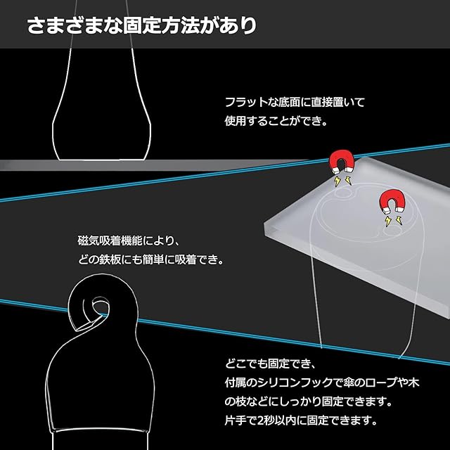 【多彩な機能と用途】①3つのライトモード:白色強光(250ルーメン/連続3時間)、白色弱光(30ルーメン/連続30時間)、赤色の点滅警告灯(30ルーメン/連続50時間)。②様々な固定方法が備わっており、フラットな底面で直接使用できるほか、磁気吸着機能により、任意の鉄製の平面に簡単に吸着させることができます。また、キーホルダーやバッグに吊るすこともできるため、非常に持ち運びに適したEDCライトです。③小型 懐中電灯、キャンプ led ミニ ランタン、ポケットライト、投光器、ナイトライト、警告灯、夜間ランニングライト、読書灯、雰囲気照明、ペット用ライトなどに使用でき、非常に実用的です。