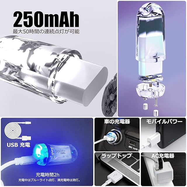 【極小なサイズと超強力な性能】①超小型のサイズで、φ2×4cmの大きさで、わずか11gの重量であり、Apple AirTagと同じ重量です。②高輝度LEDチップを採用し、最大で250ルーメンまで発光します。③充電式 250mAhのリチウムポリマー電池を内蔵し、最大50時間の連続稼働が可能です。④USBインターフェイスを備えており、いつでも簡単に充電できます。⑤スマート調整プログラムを内蔵しており、均一な明るさをします。