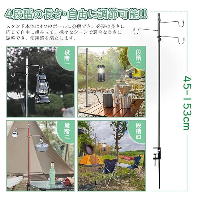ランタンスタンド ランタンポール ランタンハンガー 両用式 打ち込み クランプ式 折りたたみ 4段階 高さ調整可 ランタンフック ペグ 付き 軽量 頑丈 アウトドア キャンプ 収納袋付き By Kcmell (ブラック)