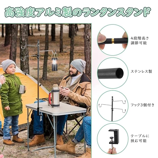 【両用式&4段階高さ調整】このランタンスタンドはテーブル・地面両用です。グランプ1個付属しており、厚さ4.5cm以内のテーブルに安定に挟む可能です。また高質量なペグを採用し、地面にスムーズに打ち込め、抜くときも簡単です!長さ同じなポール4本のため、4段階高さ調節機能があります。使用する時、フック2個搭載のポールは一番上に、シーンに応じてポールの数を選び組み立てます。