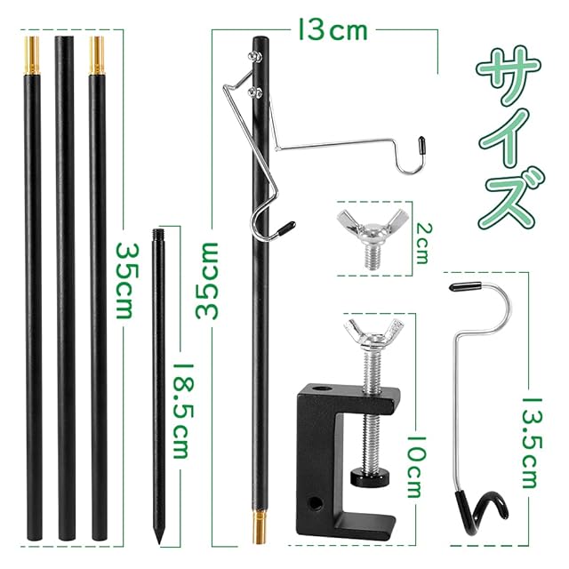 【仕様】材質:ランタンスタンド本体、長いペグ(1本)とグランプ(1個)は高強度アルミ製、ランタンハンガー(1個)とフック(2個搭載)はステンレス製、附属するフックは両端の末に滑り止めためゴムカバー付き、収納袋はナイロン製です。色:ブラック 高さ最大約156cm、直径12mm、重さ約378g(付属品含む)、耐重量1kg、 取り付け可能なテーブル厚さは3cm以内です。