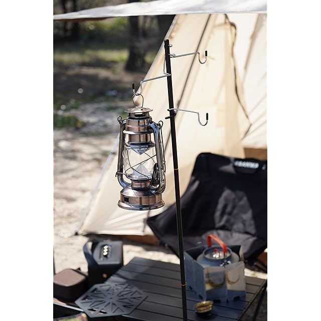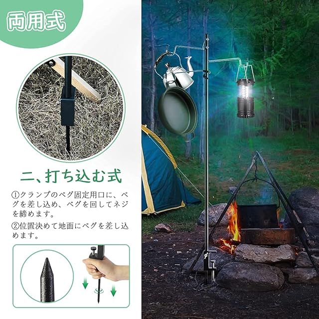 【実用性】フック2個付き以外、さらにランタンハンガー1個が付属しています。キャンプする時に、同時に鍋や水ボトルなどをかかるとも全然大丈夫です。また夜になると、鍋や水ボトルを取り外しなくても、ランタンハンガーで灯りを掛かっても大丈夫です。それ以外、取り外しできるランタンハンガーは木の枝など様々な太さの物にかけて使用可能です。