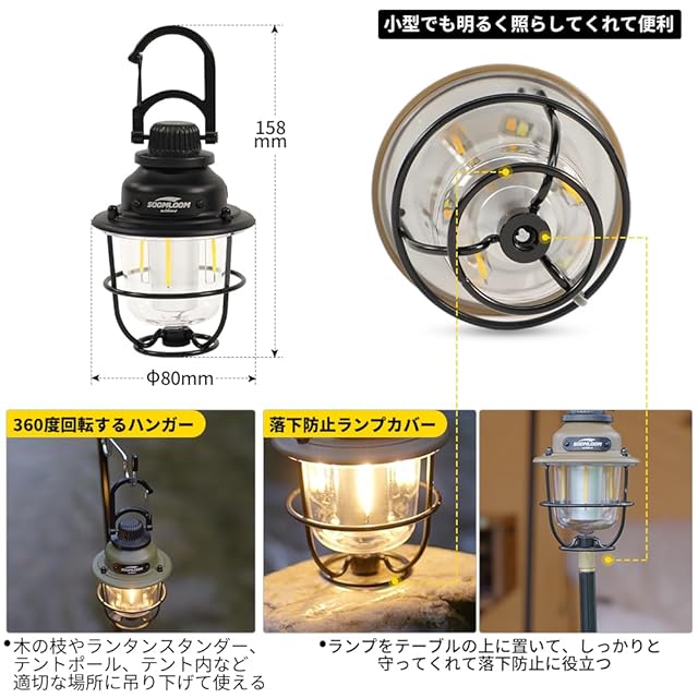 小型で軽量:LEDランタン本体サイズは(約)ɸ80x158mm、重さ(約)155g、軽量且つコンパクトで持ち運びしやすいです。