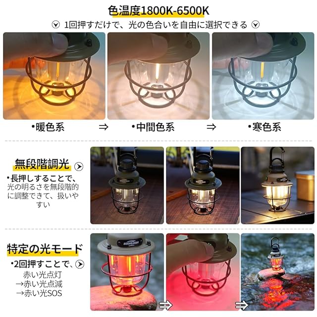 二つ点灯モード:スイッチを1回押すことで、「モード1」点灯、色合いは暖色系⇒中立色系⇒寒色系に切り替え、長押しすることで、光の明るさを無段階的に調節することができ、スイッチを2回押すことで、「特定の光モード2」点灯、赤い光点灯→赤い光点減→赤い光SOSに切り替え可能です。