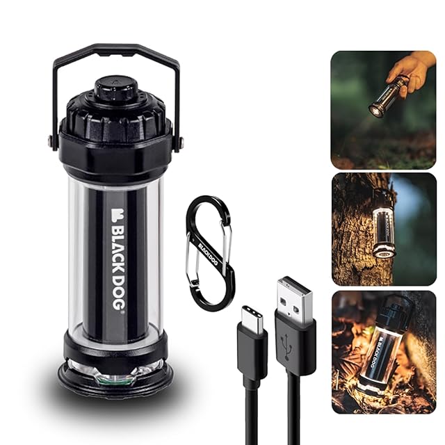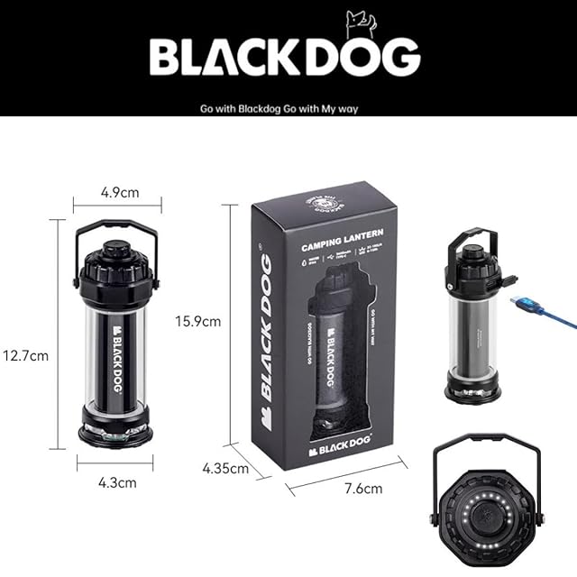 【blackdogライト・ランタン仕様】ランタン材質:ABS合金ハンドル+ABS合金ベース+PCレンズ、製品サイズ:4.9 x 4.3 x 12.7 cm、パッケージサイズ:16 x 4.5 x 7.7 cm、重量:107g、電池容量:2000mAh、充电方式:USB Type-C、ランプビーズ:LED+XPG、色温度:2800-3100K、点灯モード:4つ点灯モード、点灯時間:約6〜130時間、ルーメン:35-100ルーメン、パワー:2.8W、充電時間:4H、防水等級:IP45。