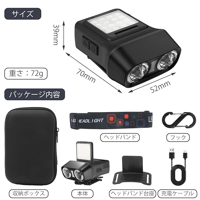 【最大900ルーメンのキャップライト】スポットライトの最大輝度は700ルーメン、パネルライトの最大輝度は500ルーメンです。 キャップランプの照明システムは、前面のLEDスポットライトと上部のLEDパネルライトで構成されており、同時に使用することで最大900ルーメンの明るさを実現します。