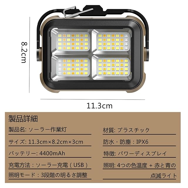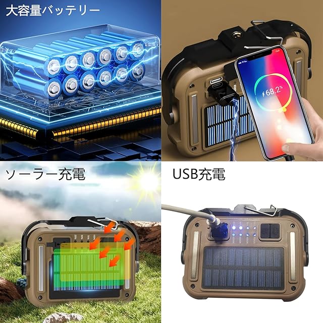 【4400mAh・ソーラー充電・Type-c充電】ランタン USBまたは太陽光で充電できる4400mAhの大容量バッテリーを搭載しています。電力表示機能付きなので、突然の電力不足を心配する必要がありません。キャンプ中にバッテリー残量が少なくなった場合は、太陽の下で充電できます。