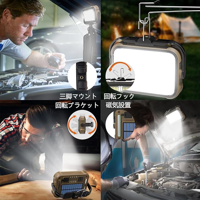 【さまざまな設置方法】照明用に物に掛けられるポータブルフックを装備しています。調整可能な角度ブラケットが付いており、さまざまな角度での照明要件に適しています。ブラケットには三脚取り付け用のネジ穴が装備されており、三脚に固定して撮影ライトとして使用できます。背面にマグネットが付いており、作業灯として鉄骨や車に取り付けることができます。