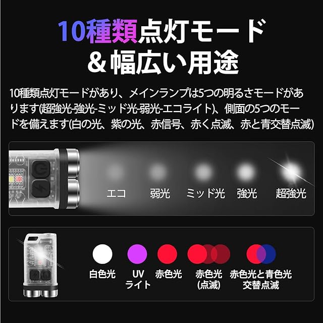 【10種類点灯モード&幅広い用途】: 10種類点灯モードがあり、メインランプは5つの明るさモードがあります(超強光-強光-ミッド光-弱光-エコライト)、側面の5つのモードを備えます(白の光、紫の光、赤信号、赤く点滅、赤と青交替点滅)。 紫の光モードは跡の識別、隠れた危険虫を現す、偽札を鑑定、蛍光剤、増白剤等の残留確認ことに役立ち、赤点滅モードがSOS救助信号として使え、日常は懐中電灯として使用します。