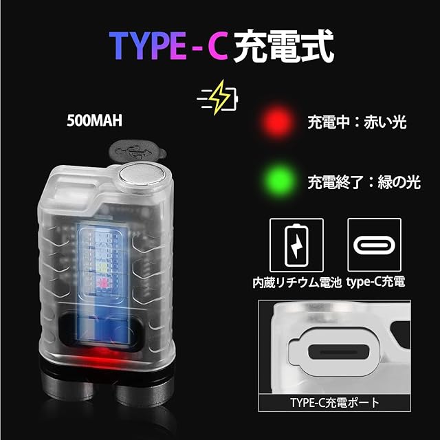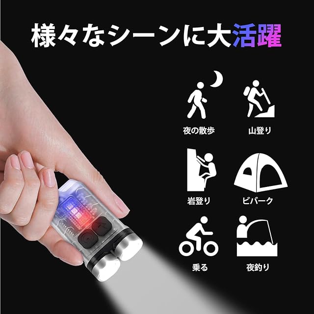 【高輝度&USB充電式】: 高輝度のXPG2*2個のLED電球を採用しており、小さいながら十分に明るい光を発します。鍵や衣服にぶら下げられる小ささで、直視厳禁の明るさ(MAX)900ルーメン)! 高品質の500mAh充電式リチウム電池を内蔵しており、約2.5時間の満充電で、2時間の連続点灯ができます。電池交換の悩みを解決して、お金と時間を節約できます。 また、充電ポートには防水ゴムプラグを採用され、水蒸気の侵入を効果的に防止し、小雨、地震、停電など万が一の時に防災用品として便利です。